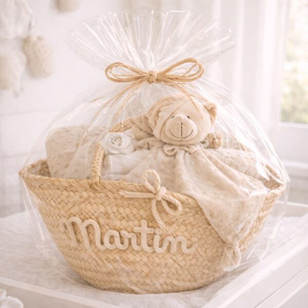 Esta canastilla está compuesta por un capazo de palma natural personalizado con el nombre del bebé, acompañado de una cuidada selección de productos esenciales para los primeros meses: manta, doudou y gasitas, todos ellos bordados con el nombre del bebé, creando un conjunto único y totalmente personalizado.